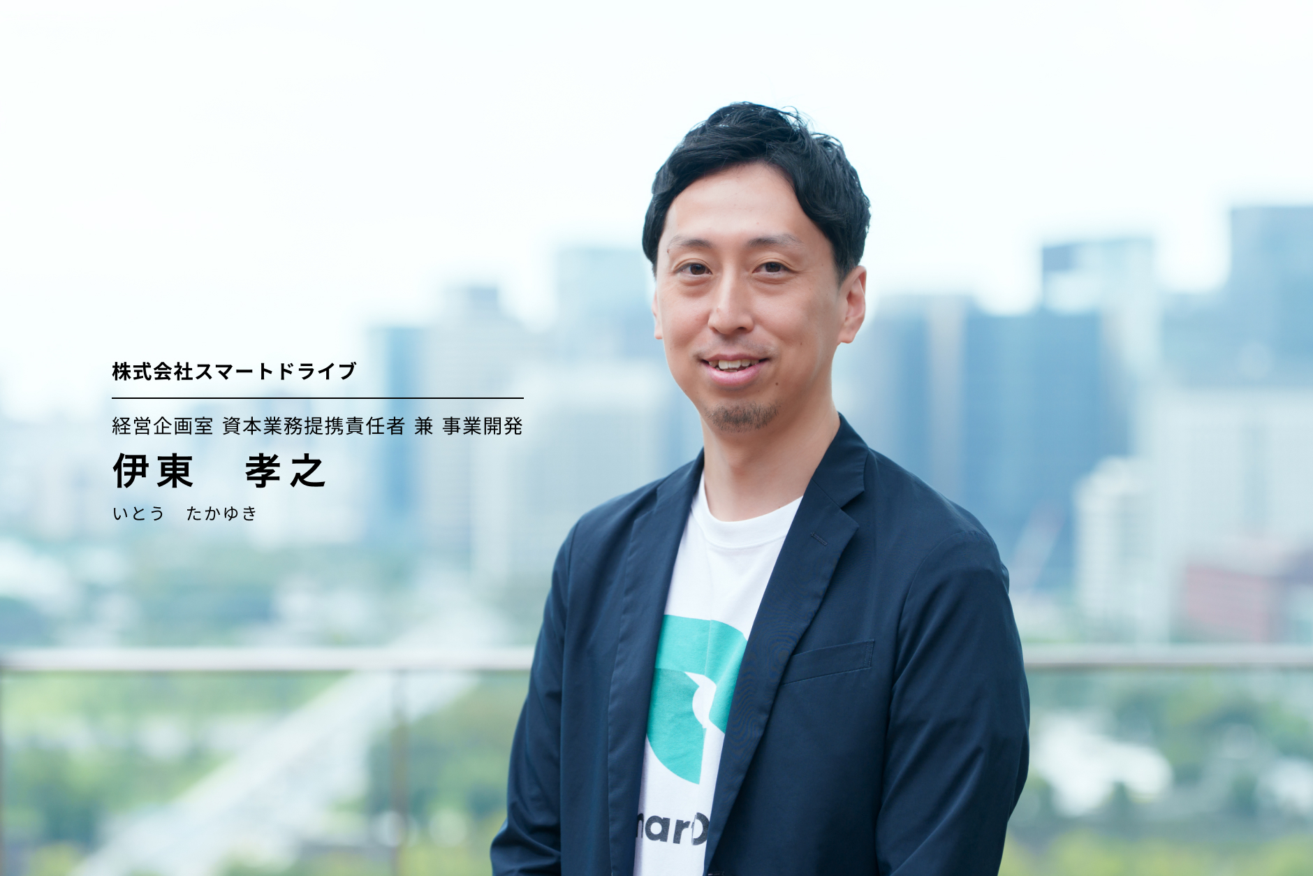 今回は、2024年5月に入社し、『ひとり経営企画室』として活躍してきた伊東孝之さんに、インターネット広告会社、エネルギー企業の社長というキャリアからスマートドライブへジョインした理由や会社を牽引する思い、そして経営企画室としてスローガン的に掲げている「鳥の目、虫の目、魚の目」についても伺いました。