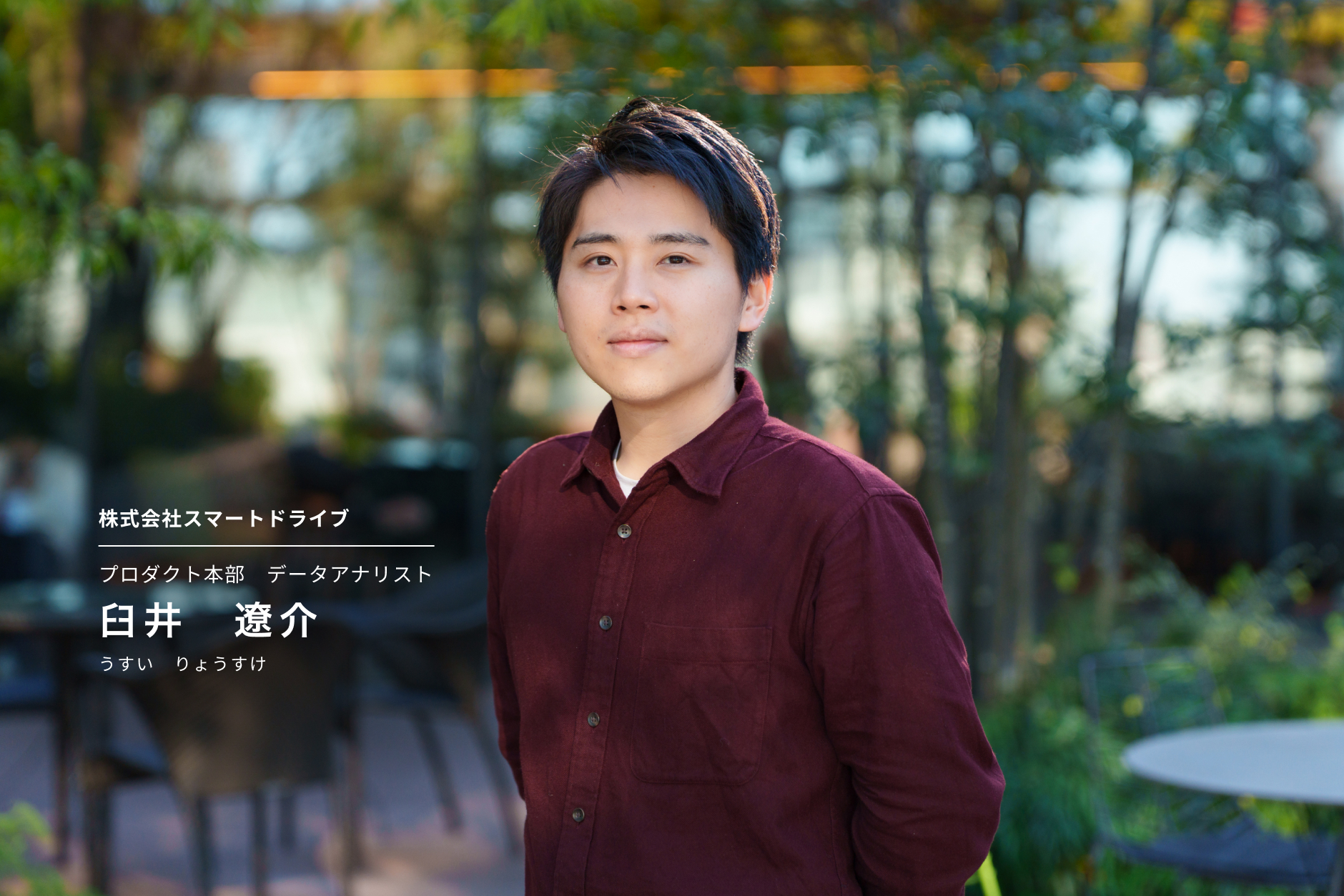 このプロジェクトの舵を取ったのは、データアナリストの臼井遼介さん。彼は、スマートドライブにとって特別な存在です。2026年4月に「新卒一括採用の一期生」の入社を控える中、2021年にインターンからそのまま正社員となった彼は、社内で「元祖・新卒一期生」と呼ばれています。