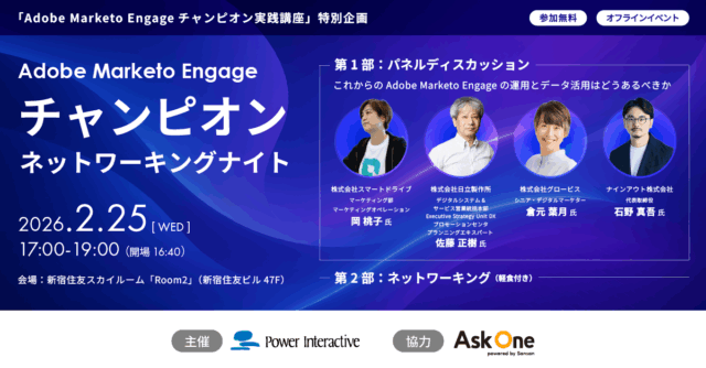 2026年2月25日(水)にPower Interractive社の主催で行われた「Adobe Marketo Engage チャンピオンネットワーキングナイト」にマーケティング部・岡が登壇した様子を … 詳しく読む